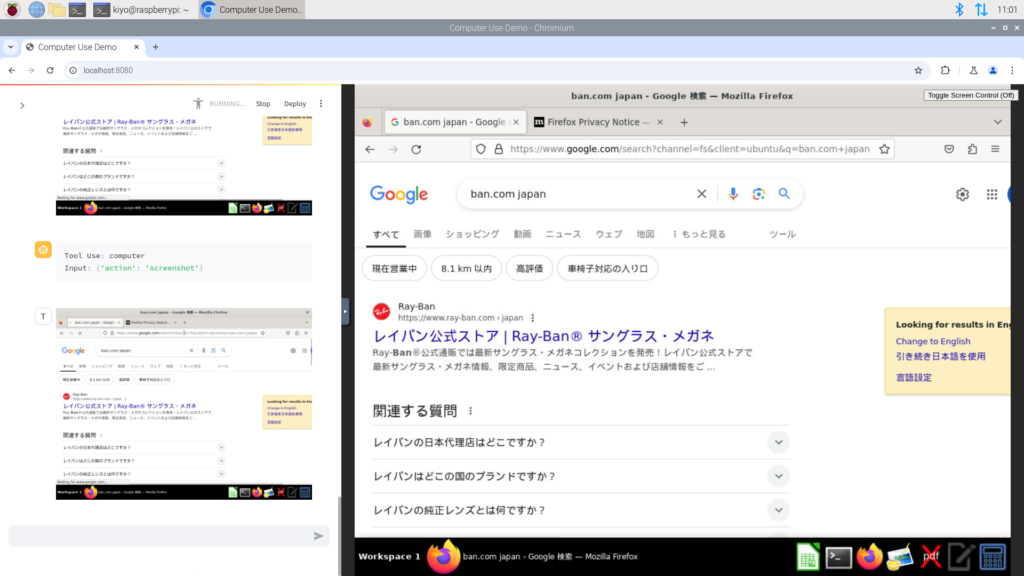 すると、Firefox が立ち上がり、Google へアクセスし、”ban.com japan” で検索を実行しました。
