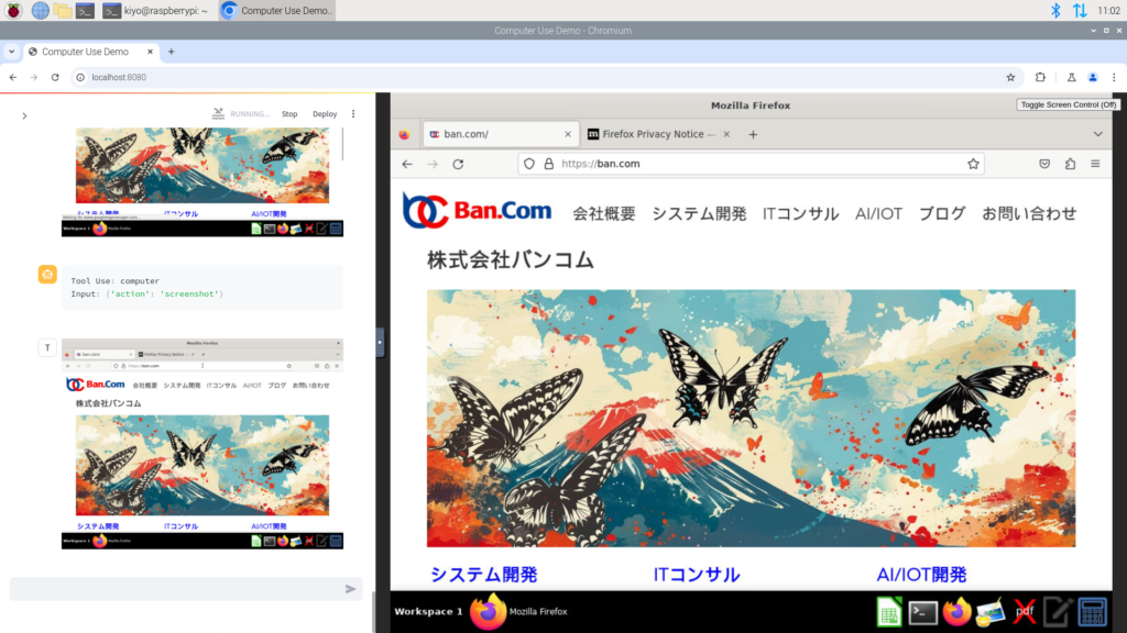 画面左に指示用LLM画面、右にOSのデスクトップが見えます。
