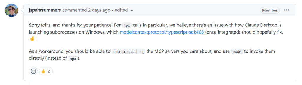 ということなので、手動で nmp install -g して、インストールし、%APPDATA%\Claude\claude_desktop_config.json に、使用するコマンド(path)と引数を定義し直すことで、正常に使用できます。