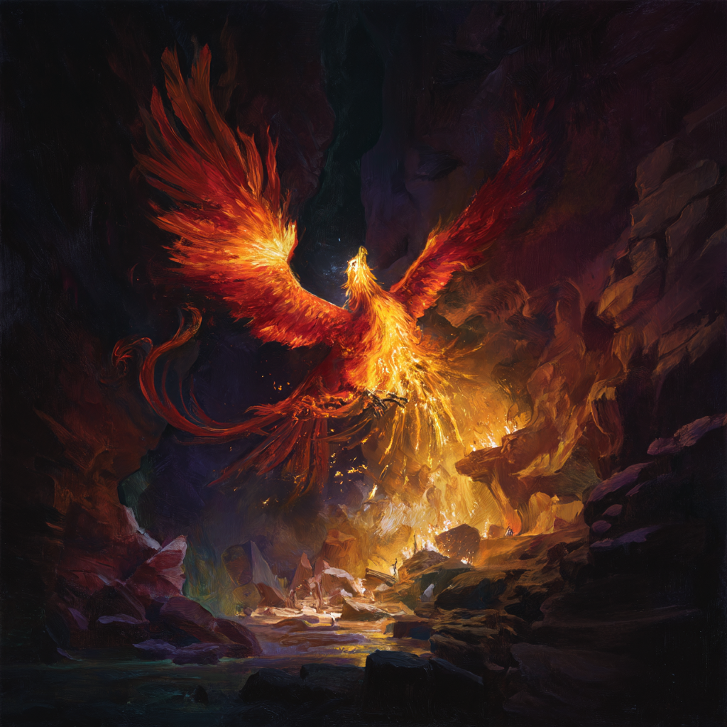 死を象徴する暗く不吉な谷から昇る不死鳥を捉えた鮮やかな高解像度写真。不死鳥は強烈な赤、オレンジ、ゴールドの鮮やかな炎に包まれ、翼を大きく広げてダイナミックに空へと舞い上がる。眼下の谷は深い影に包まれ、豊かな黒と藍色が風景を支配し、輝く不死鳥とのコントラス トを際立たせている。このシーンはドラマチックで感情的であり、陰鬱で荒涼とした背景に対して不死鳥の燃えるような輝きと動きを強調し、再生と勝利のテーマを喚起している。