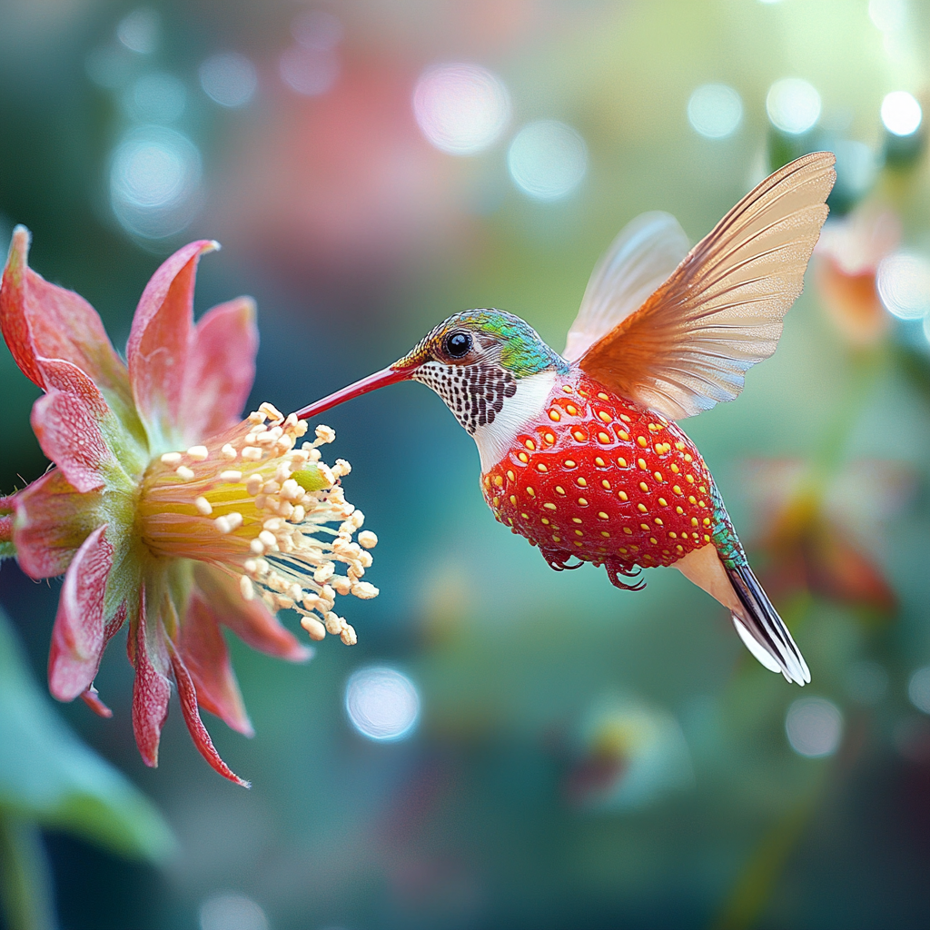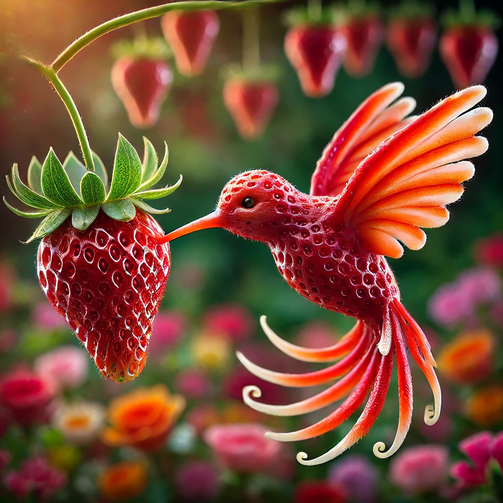 A close-up, macro photography stock photo of a strawberry intricately sculpted into the shape of a hummingbird in mid-flight, its wings a blur as it sips nectar from a vibrant, tubular flower. The backdrop features a lush, colorful garden with a soft, bokeh effect, creating a dreamlike atmosphere. The image is exceptionally detailed and captured with a shallow depth of field, ensuring a razor-sharp focus on the strawberry-hummingbird and gentle fading of the background. The high resolution, professional photographers style, and soft lighting illuminate the scene in a very detailed manner, professional color grading amplifies the vibrant colors and creates an image with exceptional clarity. The depth of field makes the hummingbird and flower stand out starkly against the bokeh background.