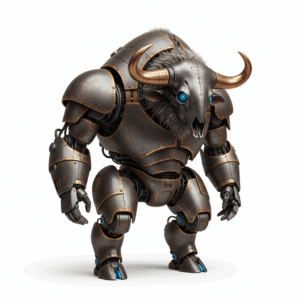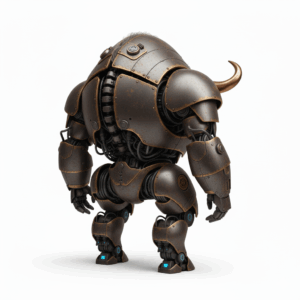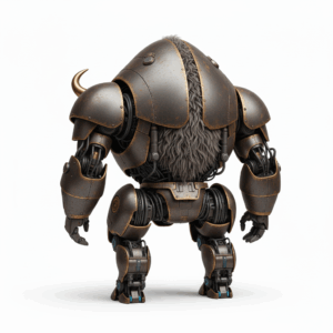 Buffalo-type robot, chubby and stout, bipedal, no background で生成させてみました。