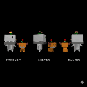 頭部: グレーの四角いボックス型。頭頂部に黄色とオレンジの花が咲いている