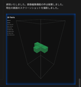 拡張機能をインストールし、プロンプトから 今の画面のスクショを取ってください。 と指示を出してみました。