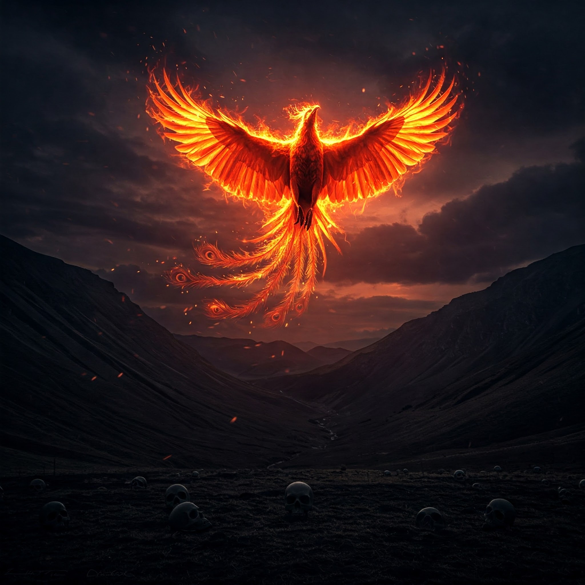 死を象徴する暗く不吉な谷から昇る不死鳥を捉えた鮮やかな高解像度写真。不死鳥は強烈な赤、オレンジ、ゴールドの鮮やかな炎に包まれ、翼を大きく広げてダイナミックに空へと舞い上がる。眼下の谷は深い影に包まれ、豊かな黒と藍色が風景を支配し、輝く不死鳥とのコントラス トを際立たせている。このシーンはドラマチックで感情的であり、陰鬱で荒涼とした背景に対して不死鳥の燃えるような輝きと動きを強調し、再生と勝利のテーマを喚起している。