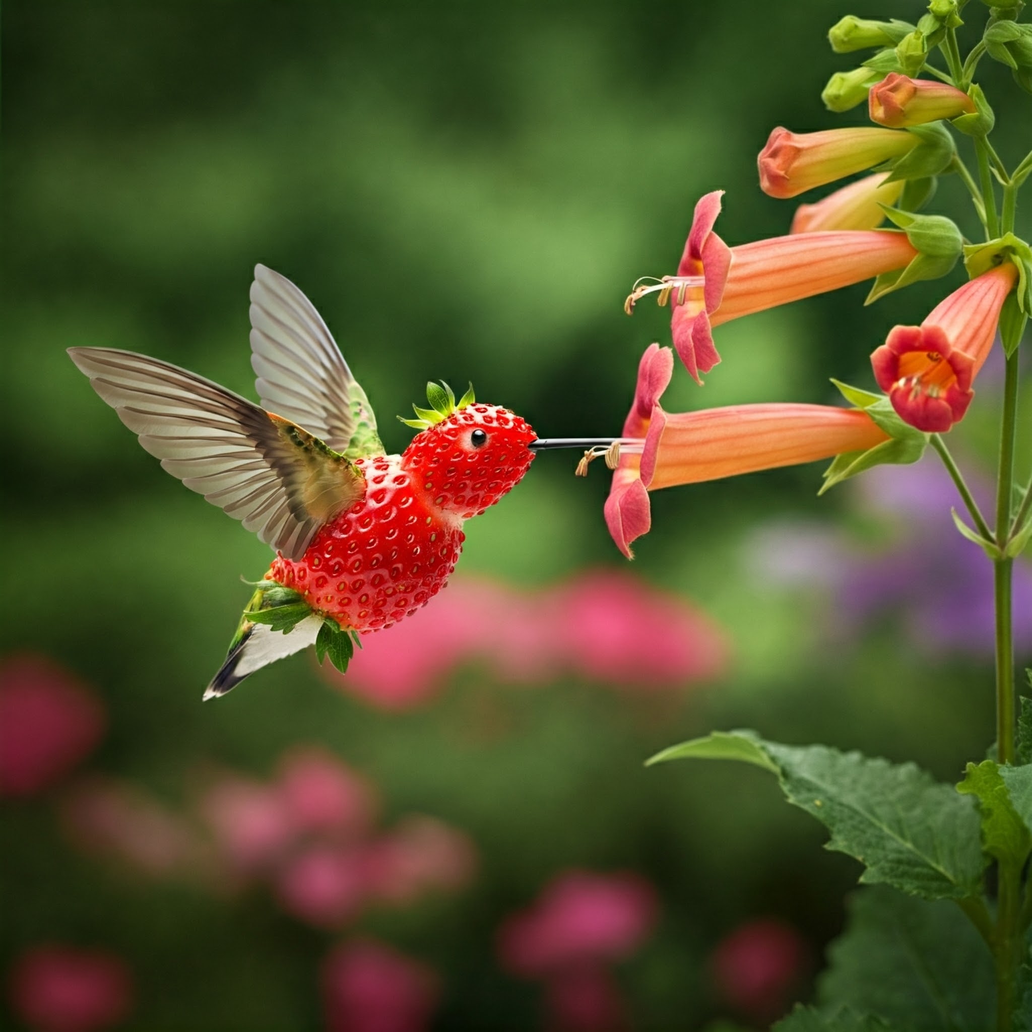 A close-up, macro photography stock photo of a strawberry intricately sculpted into the shape of a hummingbird in mid-flight, its wings a blur as it sips nectar from a vibrant, tubular flower. The backdrop features a lush, colorful garden with a soft, bokeh effect, creating a dreamlike atmosphere. The image is exceptionally detailed and captured with a shallow depth of field, ensuring a razor-sharp focus on the strawberry-hummingbird and gentle fading of the background. The high resolution, professional photographers style, and soft lighting illuminate the scene in a very detailed manner, professional color grading amplifies the vibrant colors and creates an image with exceptional clarity. The depth of field makes the hummingbird and flower stand out starkly against the bokeh background.