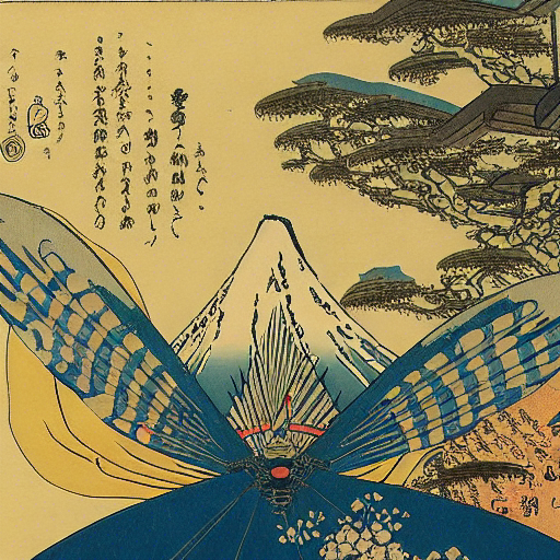 cyberpunk butterfly flying high above the mount fuji by hokusai